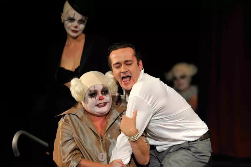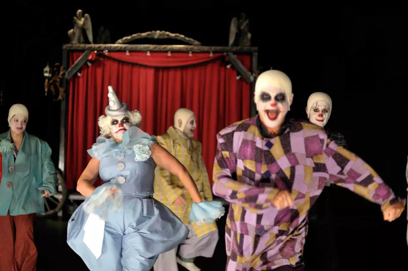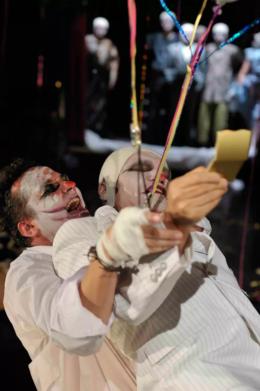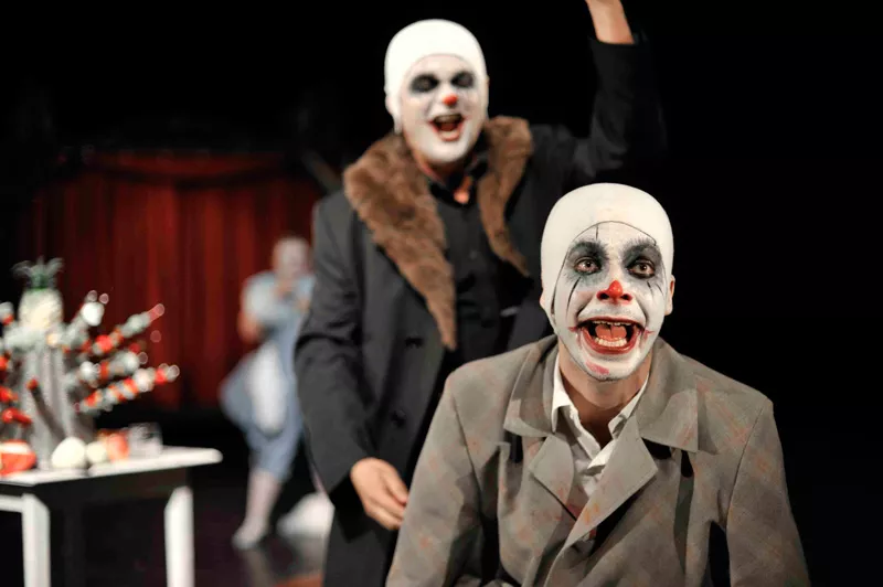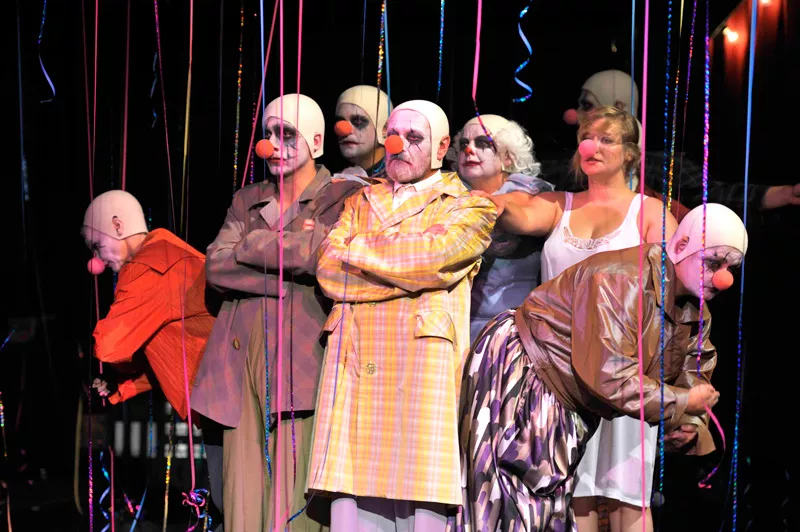 ...Nie historia pojedynczego człowieka jest jednak najważniejsza w tym spektaklu. Najciekawsza wydaje się bowiem atmosfera niepokoju, grozy i absurdu, narastająca z każdą minutą – tym bardziej odczuwalna, że została skontrastowana z rzeczywistością cyrku, kabaretu, rozrywki. Wszystkie postaci (poza głównym bohaterem – co znamienne) występują w cyrkowych kostiumach klaunów, z pomalowanymi na biało twarzami. Jeśli jednak na początku widz da się zwieść temu radosnemu nastrojowi, szybko zorientuje się, że bohaterowie kontynuują raczej tradycję smutnego klauna – zgorzkniałego i nieszczęśliwego; błazna, który owszem, śmieje się, ale śmieje się zawsze gorzko z tragizmu otaczającego go świata...